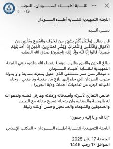 اللجنة التمهيدية لنقابة الاطباء بتنعي الطبيب السوداني الاتقتل في واو بجنوب السودان بانو قتله كان جزء من تداعيات احداث ولاية الجزيرة !!!!