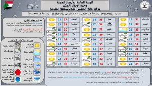 • تسود الرياح الشرقية متوسطة السرعة في اجزاء واسعة من ولاية البحر الأحمر وشمالية الي شمالية شرقية خفيفة السرعة في شمال، أواسط، شمال غرب، جنوب و غرب البلاد.