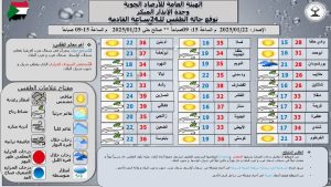 • من المتوقع أن تواصل درجات الحرارة بشقيها العظمي و الصغري انخفاضها التدريجي الطفيف ليشمل جميع أنحاء البلاد، عليه يكون الطقس حار نسبياً نهاراً و معتدل ليلاً في شمال، شمال غرب و غرب البلاد و حار نهاراً و دافئ ليلاً في شرق، اواسط و جنوب البلاد.