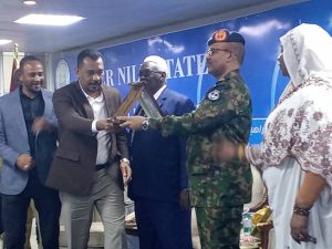 وفي الصورة عضو مجلس السيادة الانتقالي ومساعد القائد العام للقوات المسلحة والمسؤول من القطاع الاقتصادي بمجلس السيادة الانتقالي الفريق مهندس بحري ابراهيم جابر يكرم مجموعة اصيل القابضة والمدير العام المجموعة ياسر كمبال ومدير المجموعة بشندي محمد عثمان حماد يتسلمان التكريم من الفريق ابراهيم جابر بحضور والي نهر النيل محمد البدوي عبد الماجد ووزير الاستثمار الاتحادي أحلام مهدي