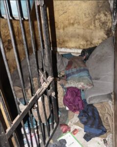 نظرة داخل “غرفة تعذيب” قذرة تديرها مليشيا الدعم السريع (الجنجويد). رغم تقييد زجاجات المياه بالسلاسل إلى الباب، أكد المعتقلون أنها نادراً ما كانت تُملأ.