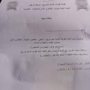 تأكيدا لما قلناه من قبل أن شوكة حوت موجودة داخل مليشيا السريع فقد تحصلت (شوكة حوت على) تفاصيل دعوة قائد الفرقة الثانية مايشى بزالنجى لعقد مؤتمر تفاكرى بغرض الحشد والتعبئة والإسناد تحت شعار (فرز البيض من الحميض) بتشربف سعادة العقيد خلا محمد أدم أبكر بنجوس والذى سيعقد فى قارسيلا بالساحة الشعبية يوم الثلاثاء ٢٢ / ٤ / ٢٠٢٥*.