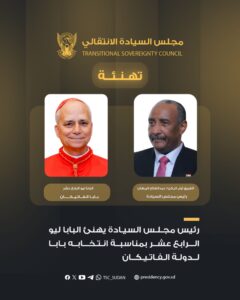 وقال البرهان في برقيته” يسعدني، أن أتقدم إلى قداستكم بإسمي وباسم شعب السودان، بأحر التهاني بمناسبة انتخابكم بابا لدولة الفاتيكان، متمنياً لكم التوفيق والنجاح في أداء رسالتكم النبيلة، وتحقيق رسالة المحبة والسلام والحوار بين الأديان وخدمة كرامة الإنسان.