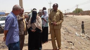 وفي الصورة وزير البنى التحتية والتنمية العمرانية بولاية نهر النيل والمدير التنفيذي يقفان على عمليات النظافة مصرف مربع ( 24) بمدينة شندي