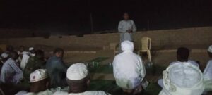 والصورة لمدير التنفيذي لمحلية شندي خالد عبد الغفار الشيخ يخاطب طرفي الصلح ولجنة المساعي حميدة من داخل المسجد عقب صلاة المغرب