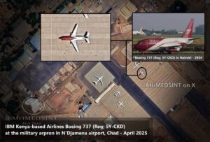 At N’Djamena Airport, Chad , is confirmed to be used by a shadowy fleet of aircraft operating flights into Sudan via RSF-controlled airstrips, such as Nyala, facilitating the transfer of military equipment and the transport of mercenaries and fighters.