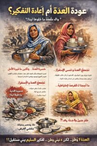اخيراً نصيحتي للعائدات رغم ان قرار العودة قرار شخصي فإن عدتي فـ(حلة و صحنين احدهما كبير و مقصوصة او مفراكة من السوق المحلي كافية جداً في الوقت الراهن .. و(بتقضي الغرض) .. فالحرب ما زالت مستمرة .. و عند اعلان وقف الحرب يمكن ان تفكروا في العودة و(بناء العدة) من جديد او تكون طريقة التفكير قد تغييرت وهذا هو المطلوب….