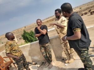 كما يظهر في الصورة المهندس حامد عبد الرحمن كلنكيت هذا الحامد الغيثاري الذي لم يتوقف لحظة كلما نادى النداء اعتقلته قحت المأفونة لعامان دون جريرة وقحت التي تفر وتهرب من مكان الى مكان، هاهو حامد كلنكيت بكل تاريخة وصولاته يلبي النداء الى الصفوف الأمامية قائدا ومقاتلا حامد كلنكيت لم تكن جديدة عليه بل هو من القلايل الذين يمهرون انفسهم ويبيعونها لله عهدا وثبات، ولسان حالة يقول سينهى التمرد على ايادينا وستعود الجزيرة خضراء ثم تقام الصلاة وقتها في كل مكان..